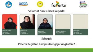 Lima mahasiswa Program Studi S1 Agribisnis lolos mengikuti program Kampus Mengajar Angkatan 2 yang dilaksanakan mulai 2 Agustus 2021 sampai 17 Desember 2021. Mereka yang mengikuti kegiatan Kampus Mengajar adalah: Dwi Lola Indah Saraswati (A1A019002) di SDN Grogolsari, Kecamatan Pucakwangi, Kabupaten Pati; Nabila Rizky Febriyanti (A1A019005) di SDN Gumelen, Kecamatan Petungkriyono Kabupaten Pekalongan; Noer Aeni (A1A019070) di SD Negeri Malabar 01 Kecamatan Wanareja Kabupaten. Cilacap; Juliyana Widiarti (A1A019079) di SD Negeri 1 Tangkisan Kecamatan Mrebet Kabupaten Purbalingga; dan Ayu Susilo Pamugkas (A1A0190111) di SDN 2 Cingebul Kecamatan Lumbir Kabupaten Banyumas.